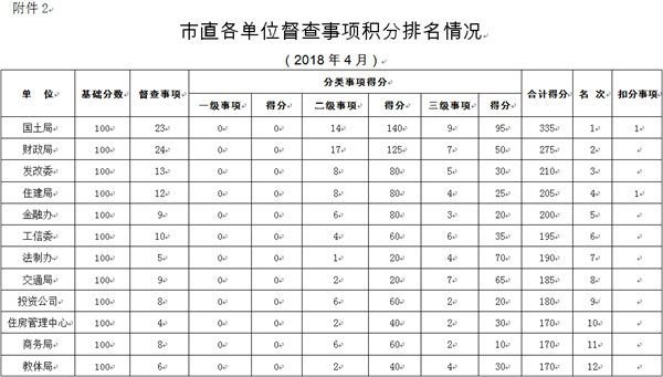 為貫徹落實市政府提出的“干成事是硬道理”的工作準則和“行動迅速、善抓落實、勇爭一流、廉政為民”的行為準則,按照《駐馬店市人民政府辦公室關(guān)于進一步加強督查工作推動政府工作高效落實的通知》(駐政辦〔2018〕1號)和《督查事項積分管理暫行辦法》(駐政督通〔2018〕20號)文件要求,市政府對督查事項實行積分管理,堅持一月一匯總,一月一排名,一月一公布。