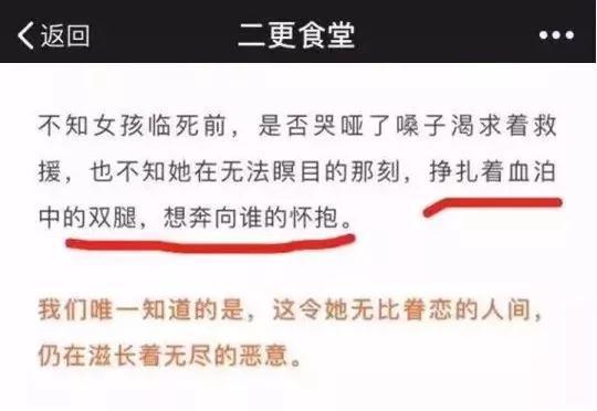 在一篇《托你們的福,那個殺害空姐的司機,正躺在家數(shù)錢》一文中,@二更食堂?用了大段類似于"小黃文"般低俗的語言,假想了空姐遇害時的遭遇。