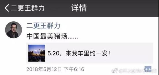 @開水族館的生物男 在微博上曬出了一張朋友圈截圖,聲稱是二更總編輯在@二更食堂 公開道歉后轉(zhuǎn)發(fā)的朋友圈,標(biāo)題赫然寫著"5.20,來我車里約一發(fā)!"