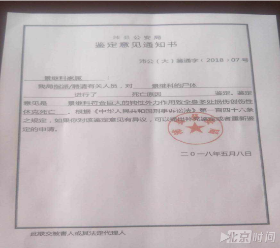 北京時(shí)間記者從這份沛縣警方出具的《鑒定意見(jiàn)通知書(shū)》中看到,景繼科的死亡原因?yàn)榫薮蟮拟g性外力作用致全身多處損傷創(chuàng)傷性休克死亡。
