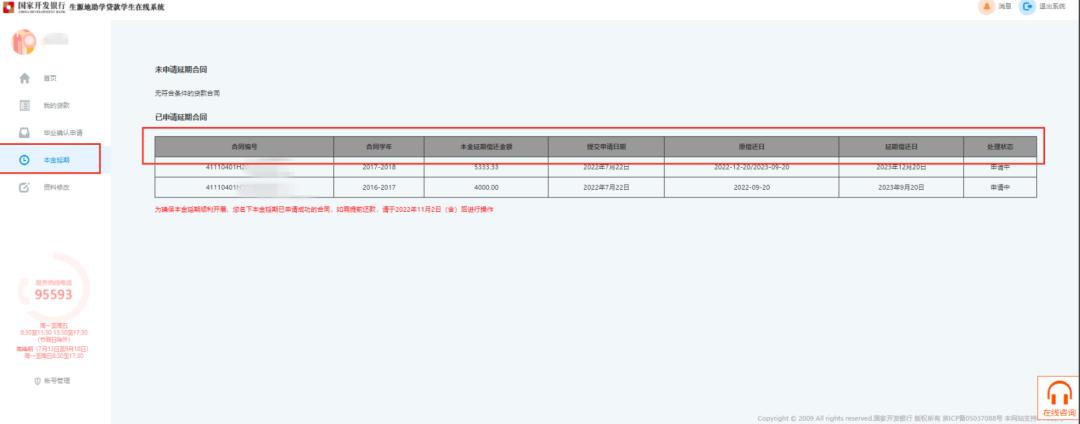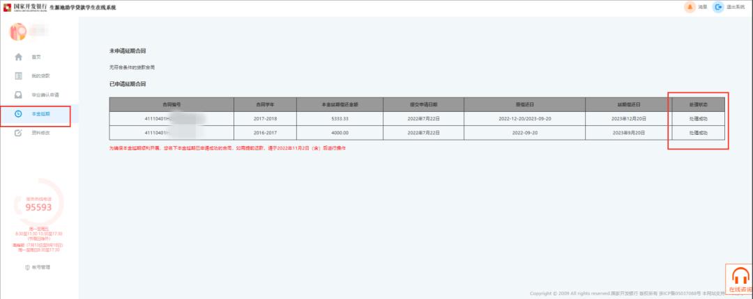 已申請“本金延期償還”的學生,不得撤銷延期申請,但在延期內可以申請?zhí)崆斑€款。如借款學生名下有多筆助學貸款合同,需在不晚于最早到期合同申請截止日前,通過學生在線系統(tǒng)一并申請,超過申請截止時間的貸款合同將無法申請。