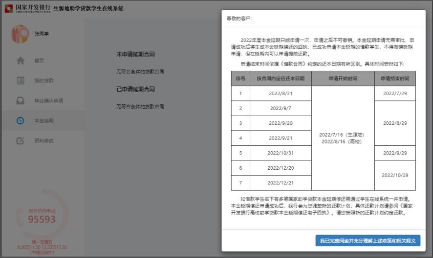 1.登陸學生在線系統(tǒng),點擊菜單列“本金延期”,彈框政策提示彈框,提示框下方設置按鈕“我已完整閱讀并充分理解上述政策和相關釋義”(圖①);