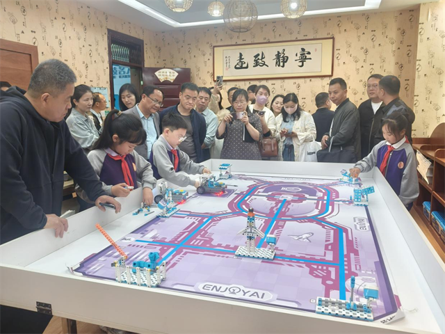 觀摩團一行走進充滿書香氛圍的校園,首先參觀了“邂逅書香·逐夢書海”整本書閱讀成果展,漫步校園文化長廊,探尋蘊含其中的教育智慧。隨后,他們深入該校東樓、南樓,走訪書法教室、美術(shù)教室、科技空間站等多個功能室集群,沉浸式感受學(xué)校“以空間重塑教育”的獨特育人生態(tài)。在科技空間站,學(xué)生們精彩的無人機障礙穿越和星空競技場演示,更是成為一大亮點。參訪校長們紛紛感嘆,從情緒管理到科創(chuàng)實踐,學(xué)校的每一處空間都在激發(fā)學(xué)生的無限潛能。這些功能室不僅是知識學(xué)習(xí)的場所,更成為五育融合的立體化育人載體,生動詮釋了駐馬店市第二十五小學(xué)“學(xué)為中心”的教育理念。