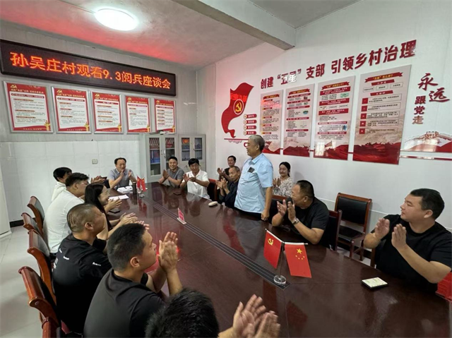 9月3日上午,孫吳莊村黨支部組織黨員群眾、退伍老兵在村委會議室集中觀看“紀(jì)念中國人民抗日戰(zhàn)爭暨世界反法西斯戰(zhàn)爭勝利80周年閱兵儀式”現(xiàn)場直播,共同見證那氣勢磅礴、振奮人心的歷史時刻。在直播過程中,大家聚精會神,被閱兵方陣那整齊劃一的步伐、威武雄壯的氣勢所震撼,不時發(fā)出陣陣掌聲。通過觀看閱兵儀式,大家深刻感受到了國家的強(qiáng)大和民族的振興,更加堅(jiān)定了愛黨愛國、為實(shí)現(xiàn)中華民族偉大復(fù)興而努力奮斗的決心。