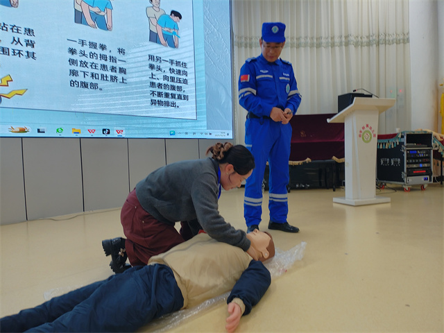 為使理論與實(shí)踐緊密結(jié)合,救援隊(duì)員們?cè)谥v解后現(xiàn)場(chǎng)進(jìn)行了規(guī)范的操作演示。從判斷環(huán)境安全、檢查意識(shí)到胸外按壓的正確姿勢(shì)、頻率與深度,再到人工呼吸的技巧;針對(duì)海姆立克急救法操作手法,一一進(jìn)行了細(xì)致展示。