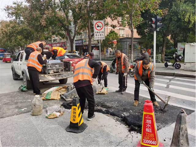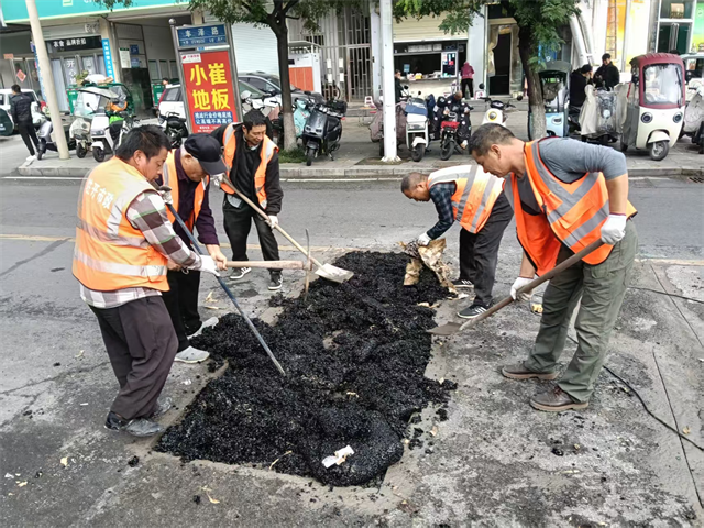 施工期間,工作人員錯時錯峰作業(yè),運用小型切縫機、電鎬、平板夯等設備,用瀝青冷補料應急維修路面“小坑微塘”,保障道路完好平整,守護群眾“腳下安全”。截止目前,已維修破損瀝青路面11處。