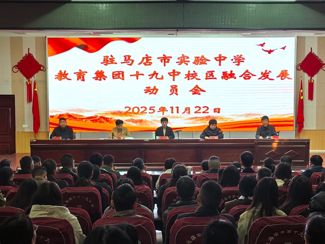 為深入推動(dòng)區(qū)域教育資源優(yōu)化整合,加快實(shí)現(xiàn)優(yōu)質(zhì)教育資源普惠共享,2025年11月22日上午,駐馬店市實(shí)驗(yàn)中學(xué)教育集團(tuán)十九中校區(qū)融合發(fā)展動(dòng)員會(huì)在駐馬店市第十九初級(jí)中學(xué)報(bào)告廳順利召開(kāi)。開(kāi)發(fā)區(qū)教育文化事業(yè)發(fā)展中心班子成員、股室負(fù)責(zé)人、駐馬店市實(shí)驗(yàn)中學(xué)本部及分校管理干部、駐馬店市第十九初級(jí)中學(xué)全體教師參會(huì)。